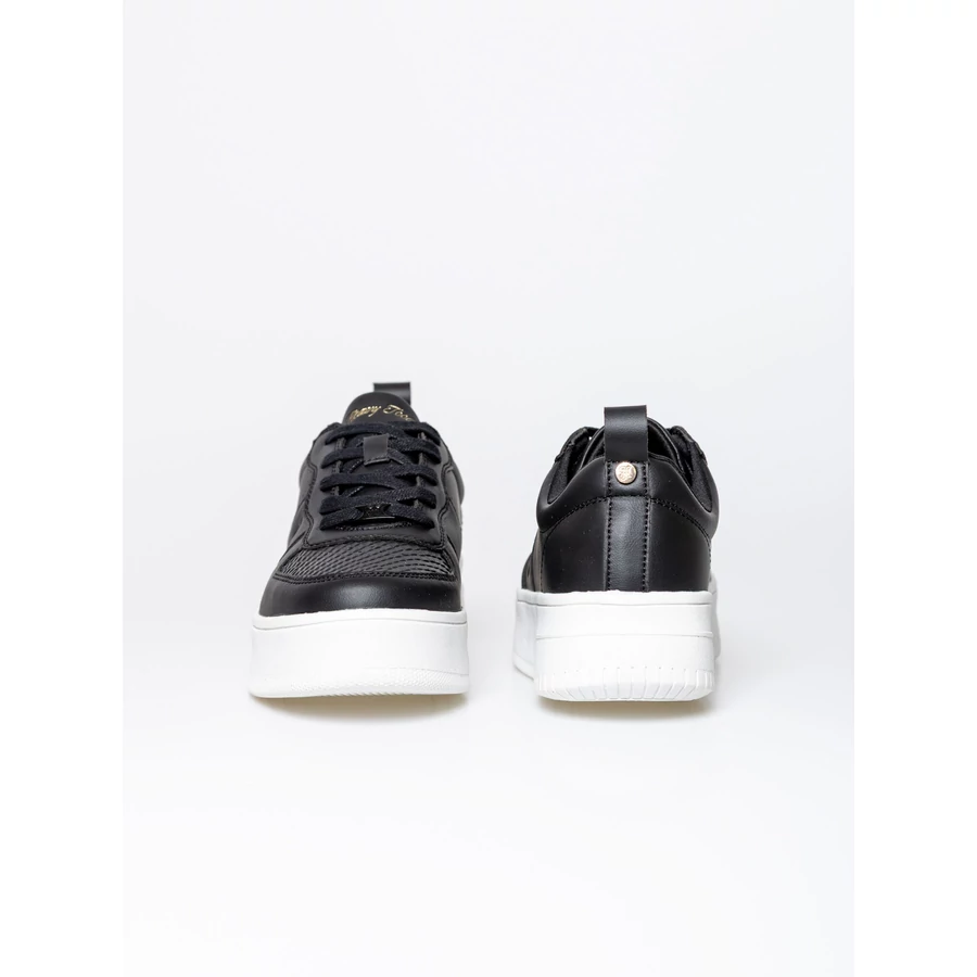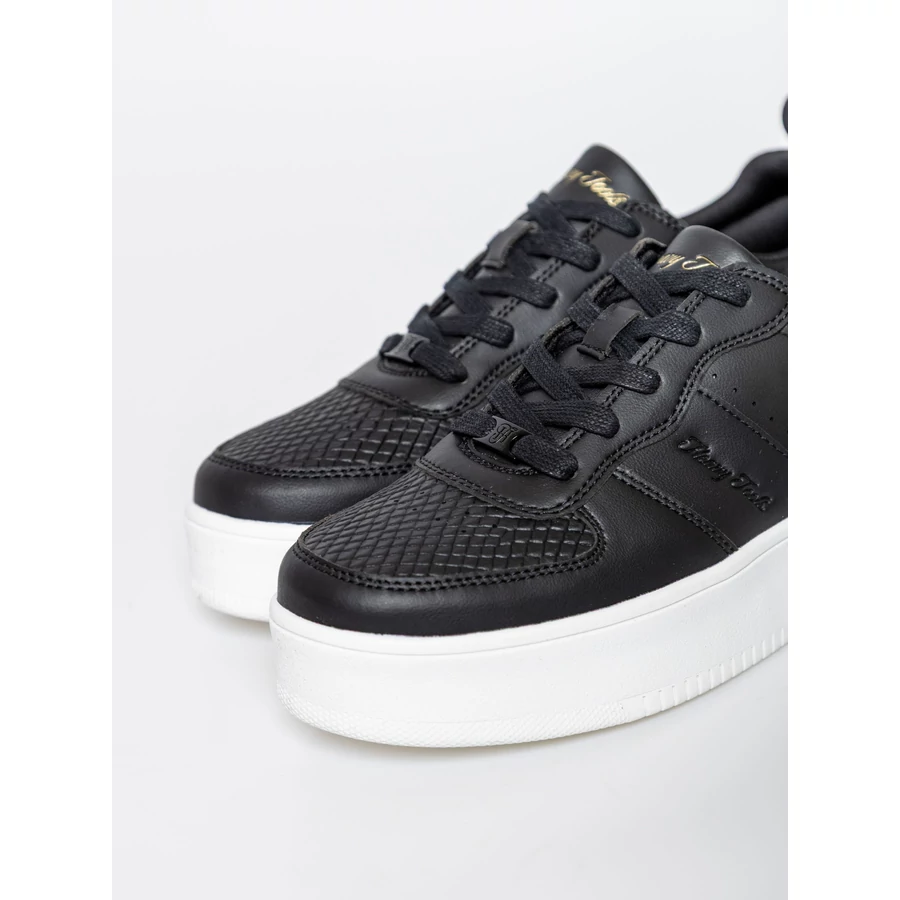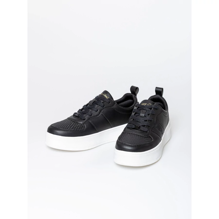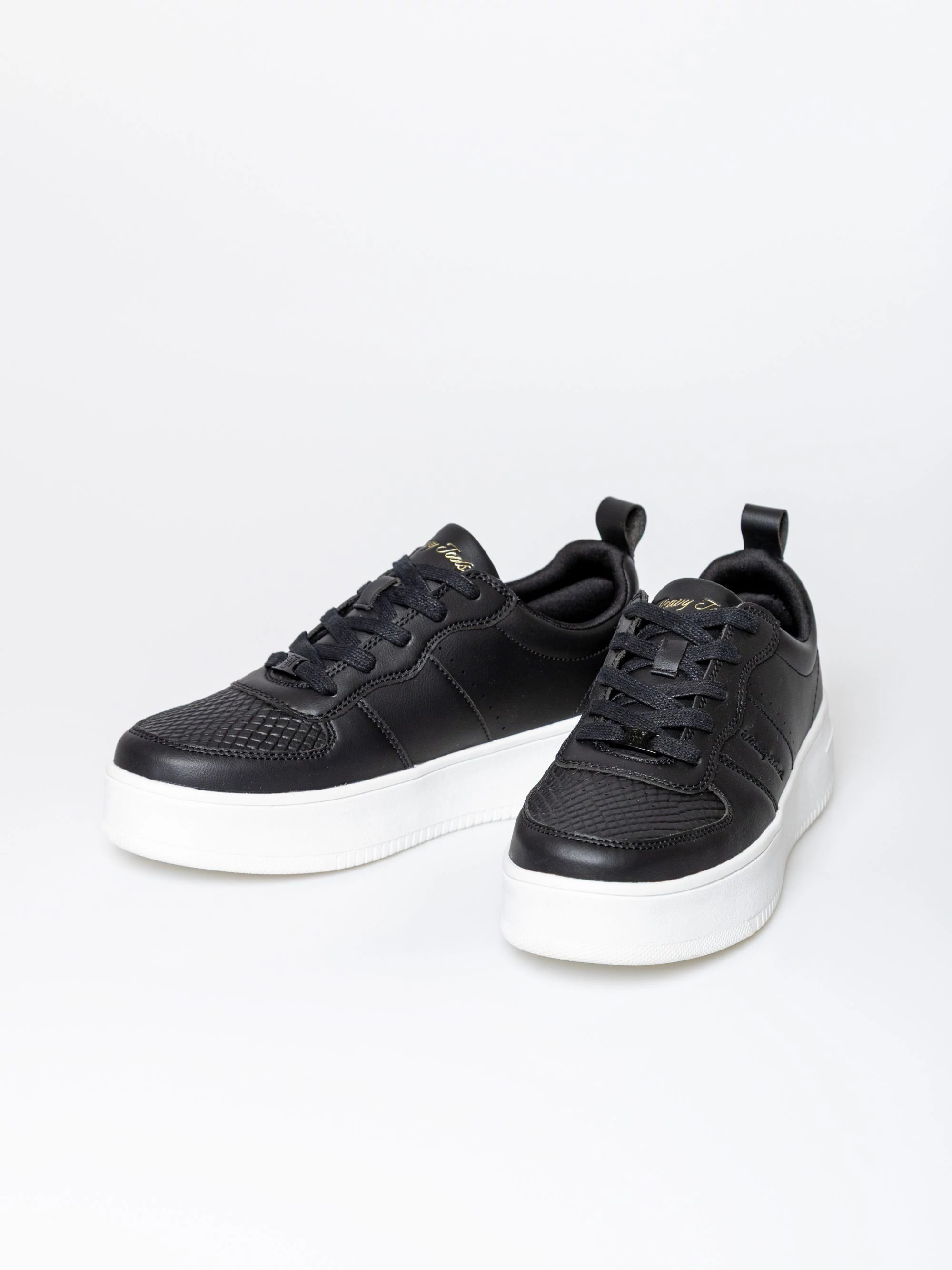 Női utcai edzőcipő, párnázott bokával, jól szellőző anyagból, magasított talppal, oldalán, nyelvén, fűzőjén és sarkán kis márkajelzéssel. Anyaga: felsőrész: poliuretán műbőr, bélés: mesh, talp: TPR