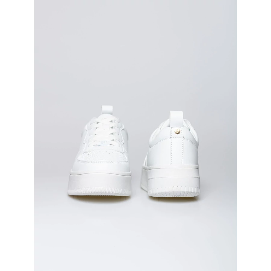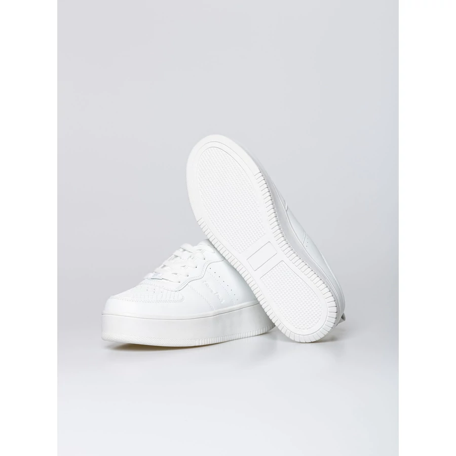 Női utcai edzőcipő, párnázott bokával, jól szellőző anyagból, magasított talppal, oldalán, nyelvén, fűzőjén és sarkán kis márkajelzéssel. Anyaga: felsőrész: poliuretán műbőr, bélés: mesh, talp: TPR